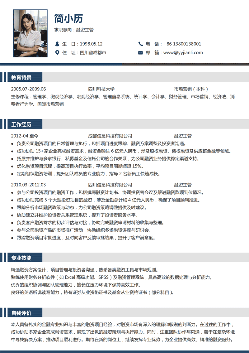 融资主管简历自我评价范文:熟练使用财务分析软件(如Excel高级功能、SPSS)及融资管理系统,具备高效的数据处理与分析能力。